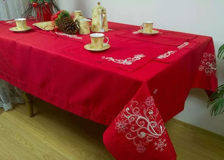 С такой новогодней скатертью сказочно-праздничное настроение гарантировано! Судите сами: красный, с белым вышитым орнаментом - будто сам Мороз нарисовал его для вас, украсив его своим эфемерным шлейфом.