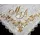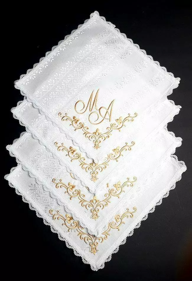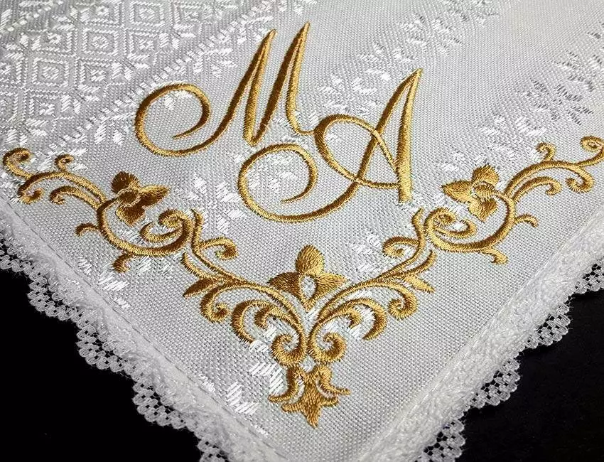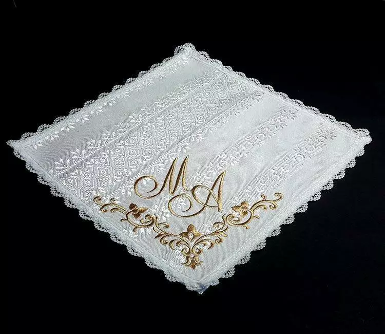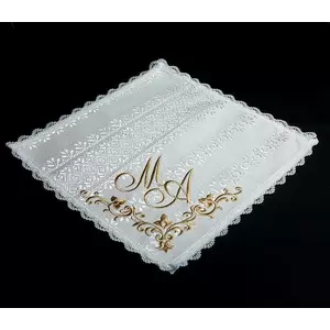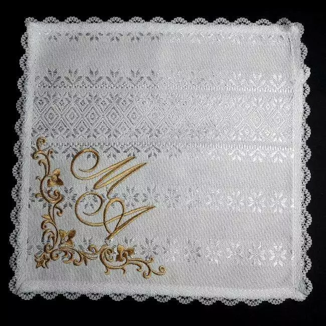 Серветка на білому полотні з білим тканим орнаментом, малюнок (ваші ініціали) вишитий гладдю золотистими нитками.