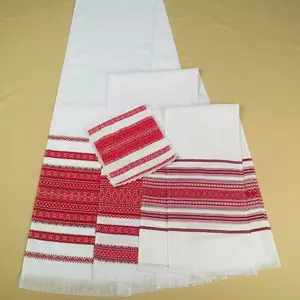 Білосніжні рушники і серветка з тканим орнаментом. Орнамент (Алатир) виконаний блискучими нитками, що надає цим весільним рушникам нарядності. Тканий орнамент поблизу виглядає як вишивка гладдю, а за ціною набагато доступніше.
