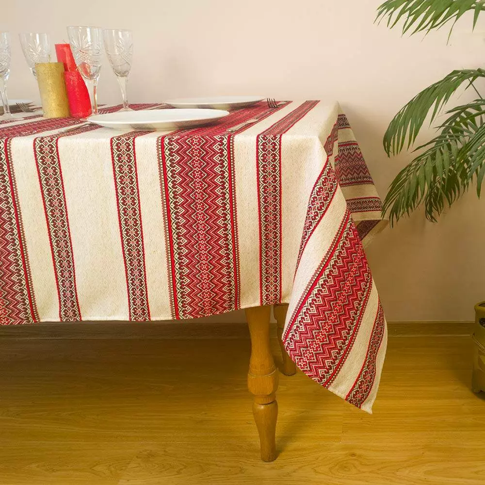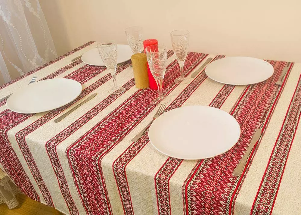 У нас большой выбор тканых вышитих скатертей с украинским орнаментом.