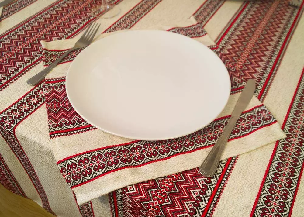Лляна скатертина з орнаментом Червоний, 220х145 см, + 6 серветок