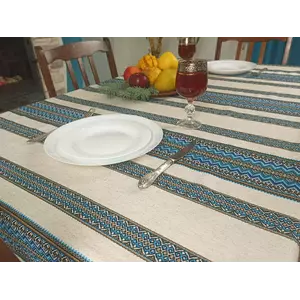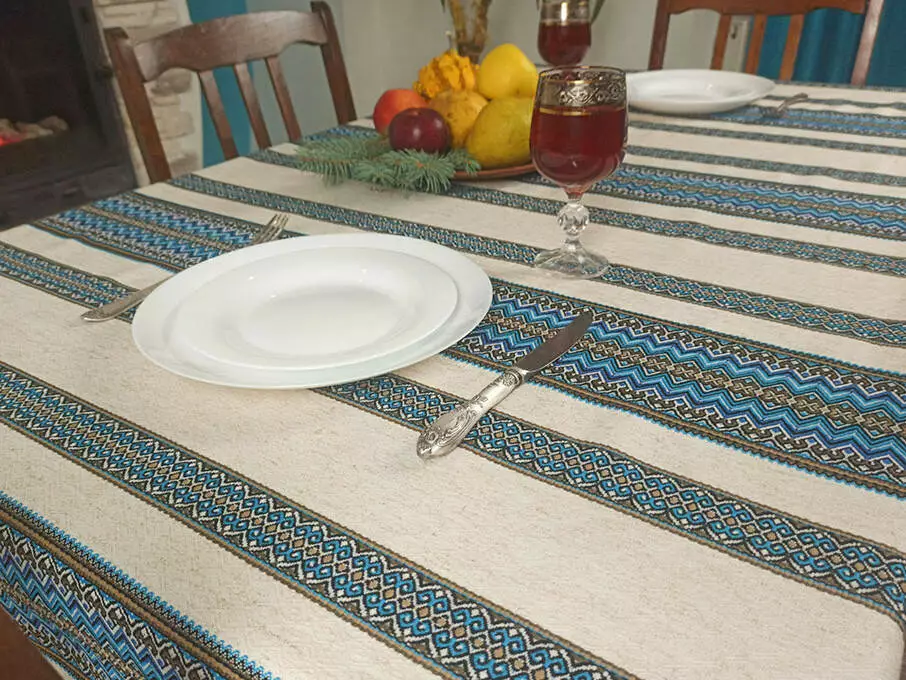 Лляна скатертина з орнаментом Синій, 220х145 см, Без серветок