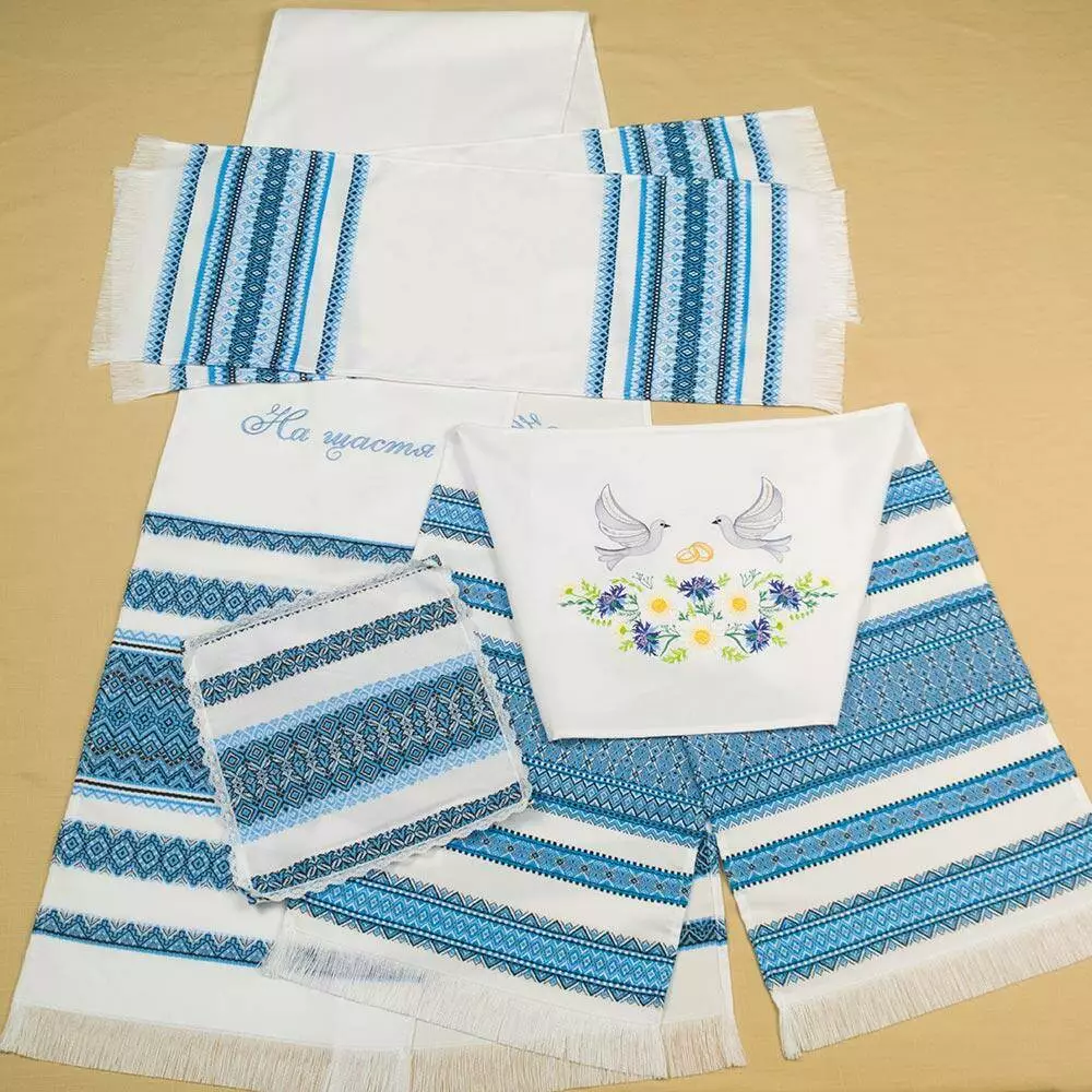 Рушники і серветка с тканим синім орнаментом. Орнамент зроблений з акрилових ниток, що надає їм святкового вигляду. Тканий орнамент зблизька виглядає як вишивка гладдю, а по ціні набагато доступніше.