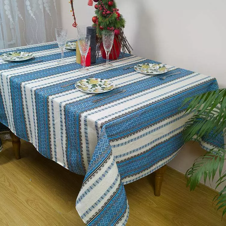 Воздушная и озорная, как весенняя капель, легкая и ненавязчивая, как детский смех, эта скатерть украсит любой ваш праздник! Кто-то видит в ее орнаменте снежинки (чем не замечательная идея: подарить такую скатерть к Новому году?). Кто-то узнает автентичные символы. Кому-то по вкусу бирюзовая яркость на бежевом фоне, будто глубокое мирное небо.
