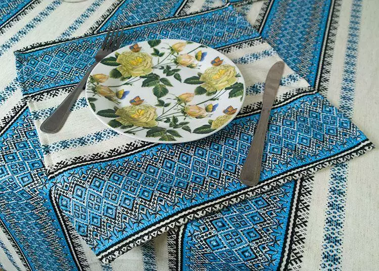 Новорічна скатертина з народним орнаментом 134x145 см, + 6 серветок, Синій