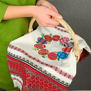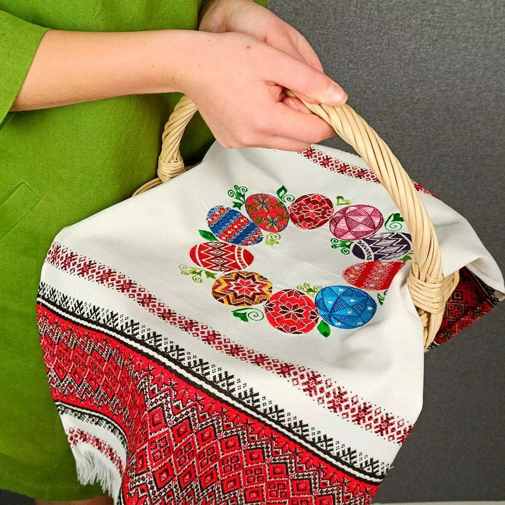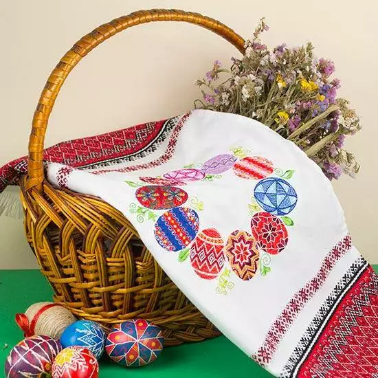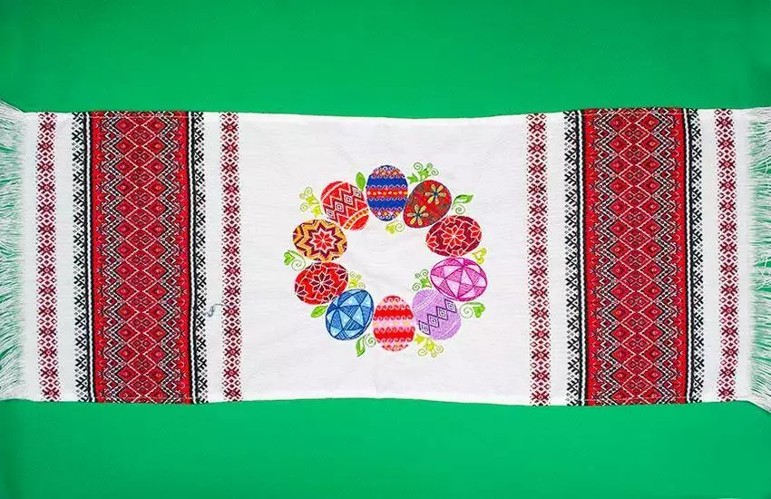 Червоно-чорний орнамент тканого пасхального рушника урізноманітнює яскрава вишивка гладдю з барвистим віночком писанок. На писанках – традиційні символи Сонця, життя, здоров’я та родючості.