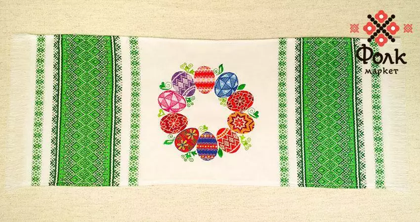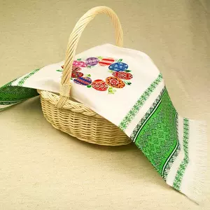 Насичено-зелений орнамент тканого пасхального рушника урізноманітнює яскрава вишивка гладдю з барвистим віночком з писанок. На писанках – традиційні символи Сонця, життя, здоров’я та родючості. Цей рушник – один із фаворитів наших покупців! Купують його для себе, а також у подарунок. Діліться радістю з близькими!