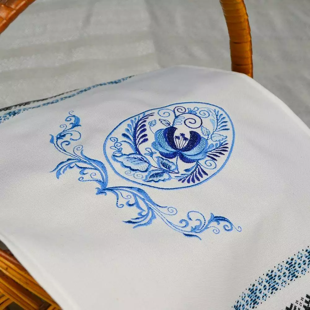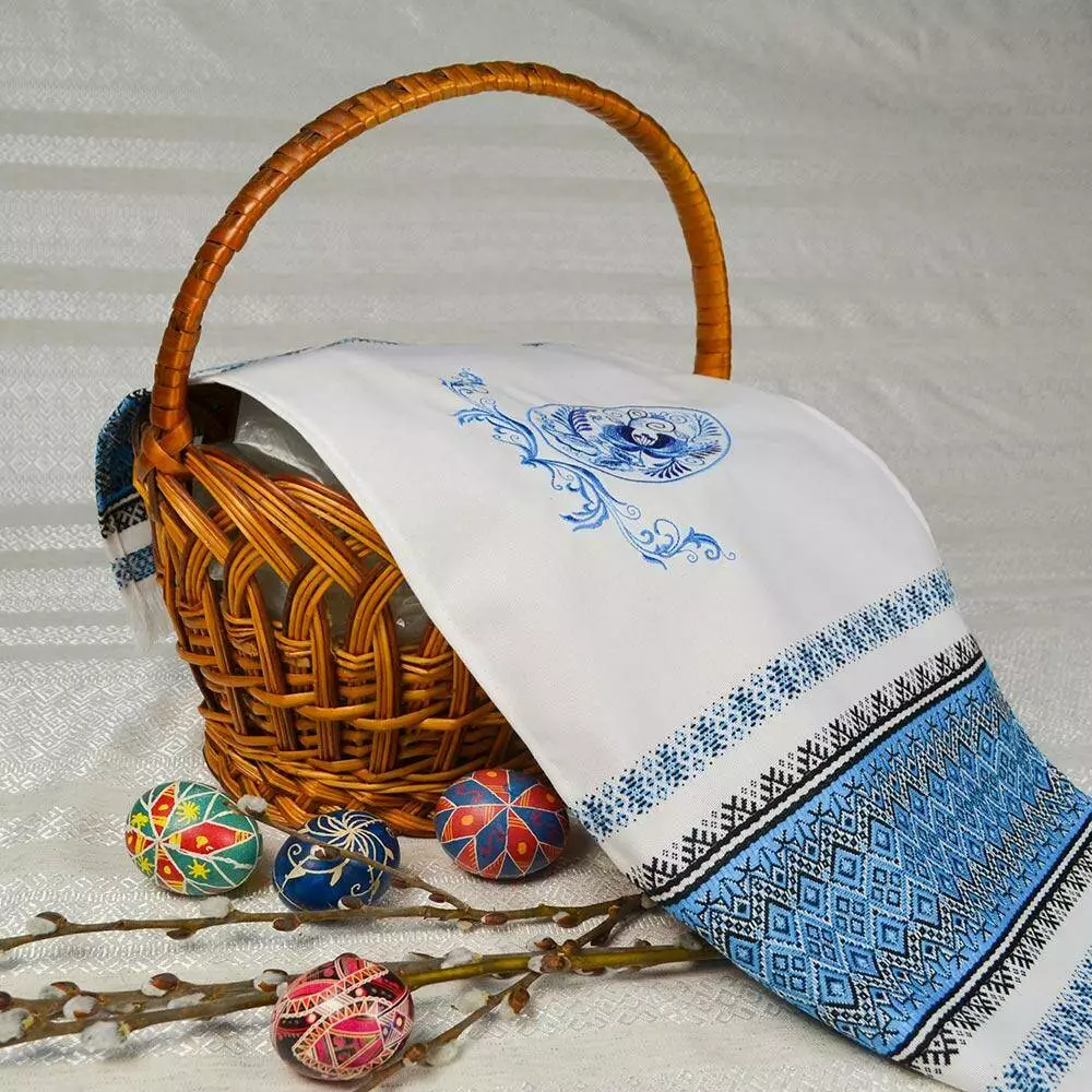 Синый орнамент тканого пасхального рушника урізноманітнює яскрава вишивка гладдю. На писанці – традиційний орнамент "Гжель".