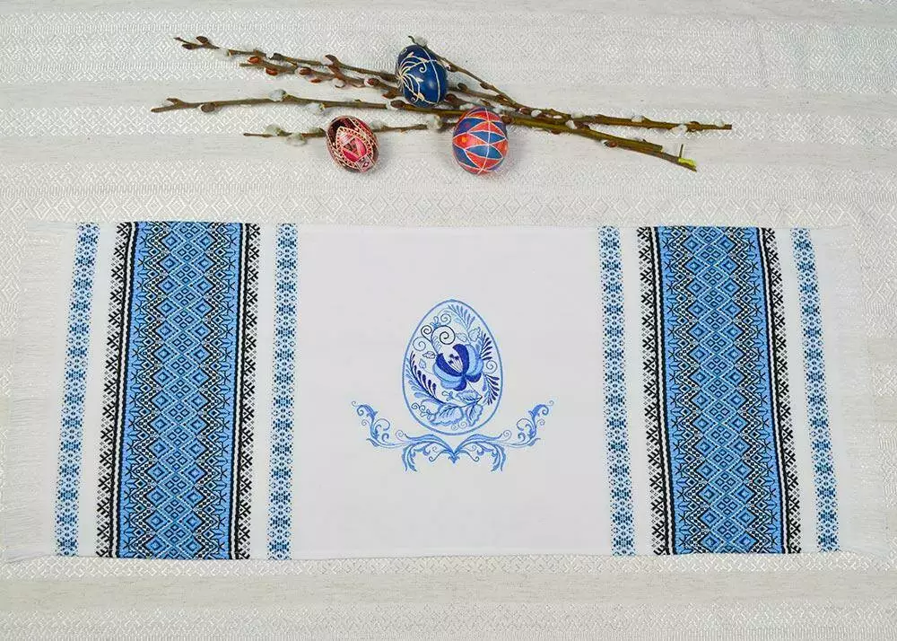 Синый орнамент тканого пасхального рушника урізноманітнює яскрава вишивка гладдю. На писанці – традиційний орнамент "Гжель".