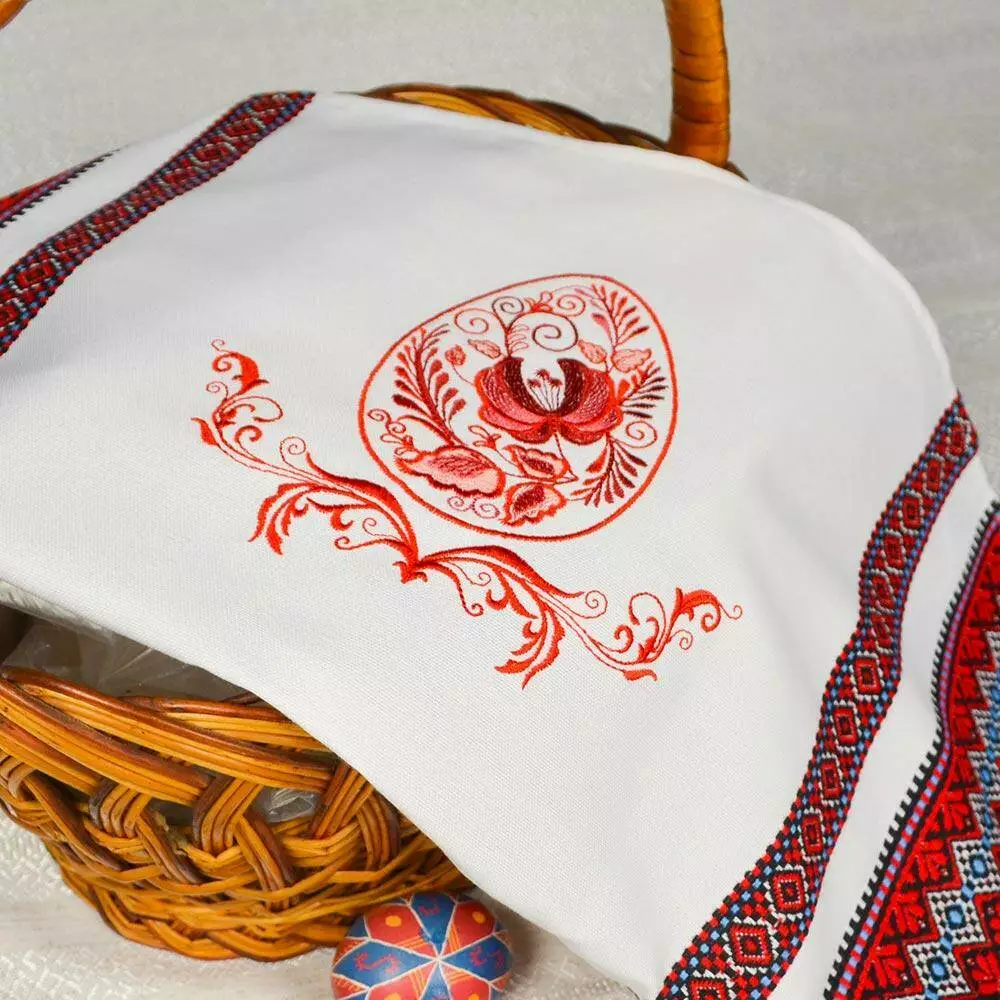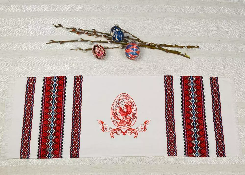 Червоний орнамент тканого пасхального рушника урізноманітнює яскрава вишивка гладдю. На писанці – традиційний орнамент "Гжель".