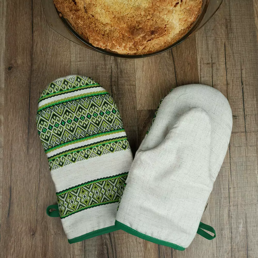 Красочная прихватка-варежка для кухни непременно станет надежным помощником любой хозяйки! Достаточно плотная ткань и мягкий наполнитель позволяют прихватке долго служить Вам и оберегать Ваши пальчики от нежелательного перегревания в процессе готовки. Этнический орнамент добавит в интерьер народных нот. Благодаря петельке этот кухонный аксессуар всегда будет на своем месте.