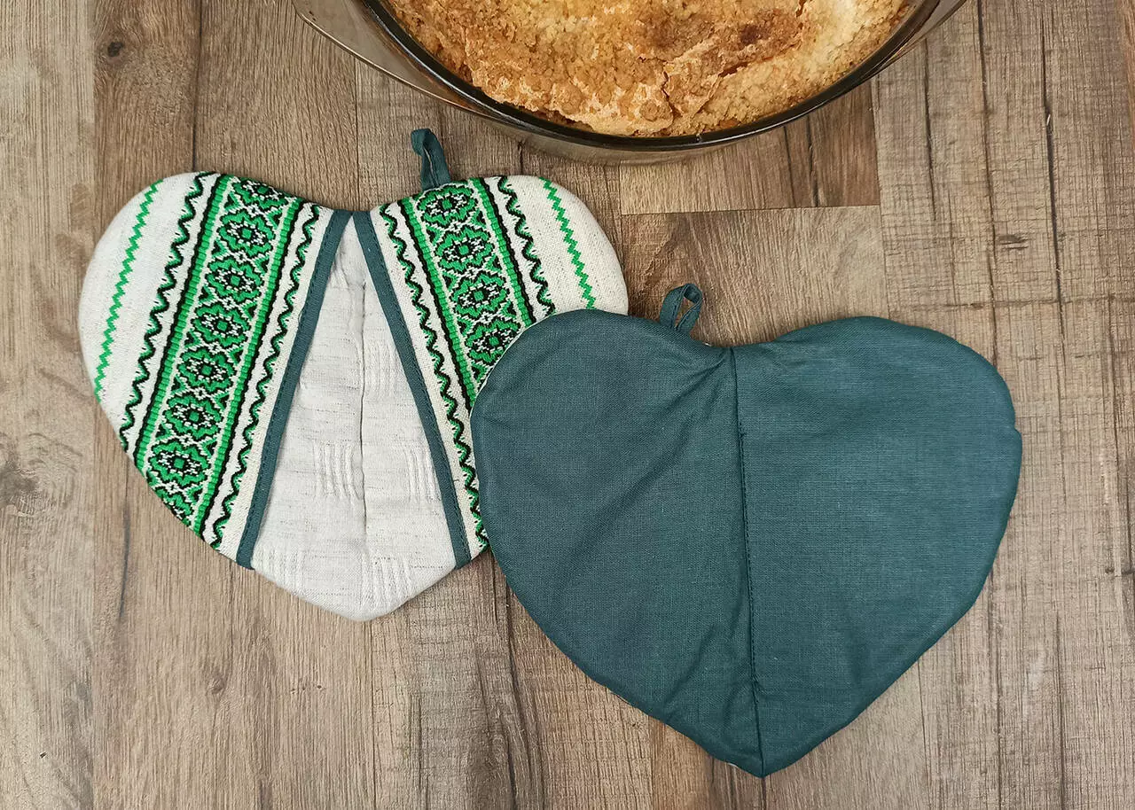 Эта сердцеподобная прихватка непременно пригодится на кухне заботливой хозяйки! Особенно если кухне свойственны черты этно стиля. Мягкий наполнитель между двух слоев износостойкой, хотя и тонкой ткани позволяет этому аксессуару длительное время выдерживать трудовые будни. Прихватка удобна в использовании , поскольку запросто складывается пополам по продольной строчке. Благодаря текстильной петельке она всегда будет около варочной поверхности.