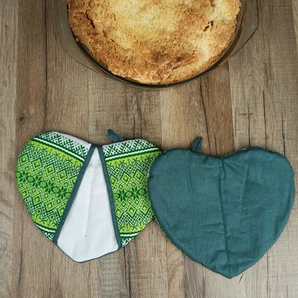 Эта сердцеподобная прихватка непременно пригодится на кухне заботливой хозяйки! Особенно если кухне свойственны черты этно стиля. Мягкий наполнитель между двух слоев износостойкой, хотя и тонкой ткани позволяет этому аксессуару длительное время выдерживать трудовые будни. Прихватка удобна в использовании , поскольку запросто складывается пополам по продольной строчке. Благодаря текстильной петельке она всегда будет около варочной поверхности.