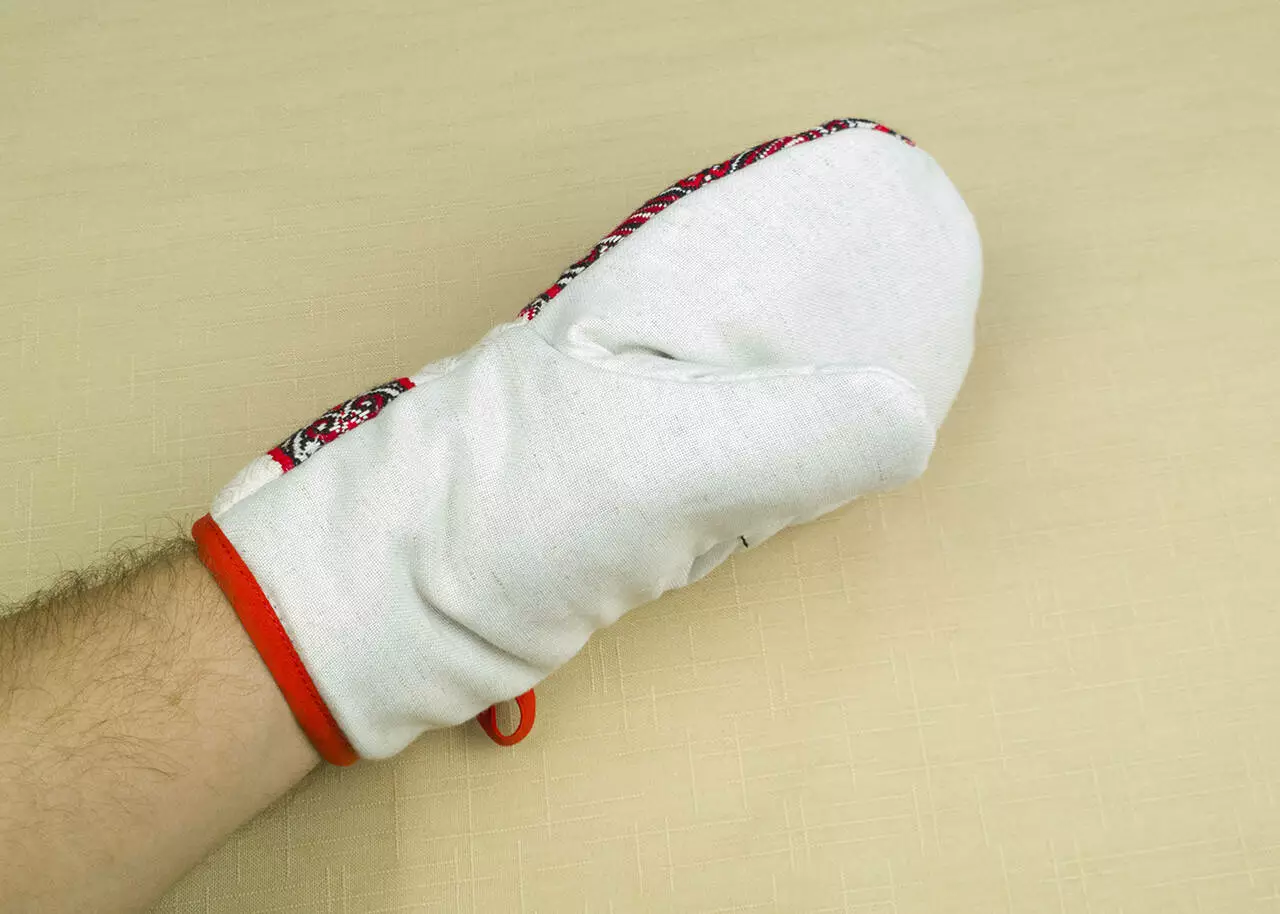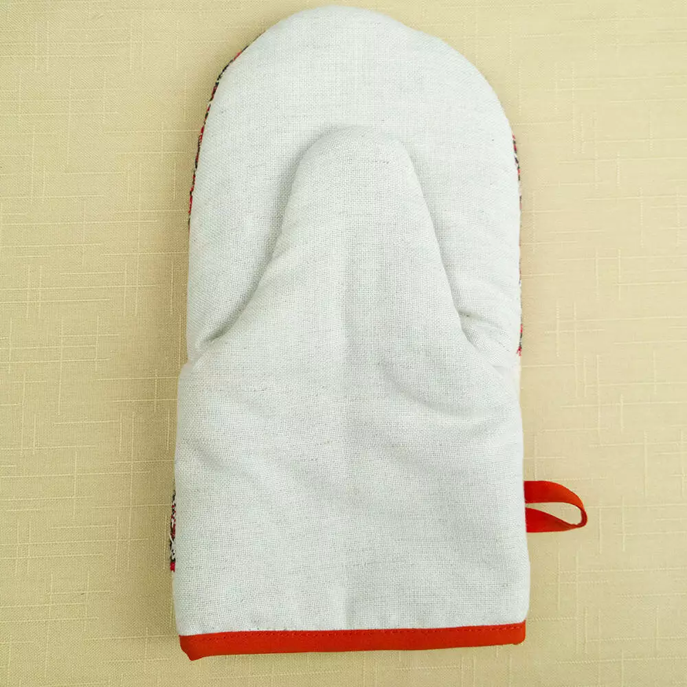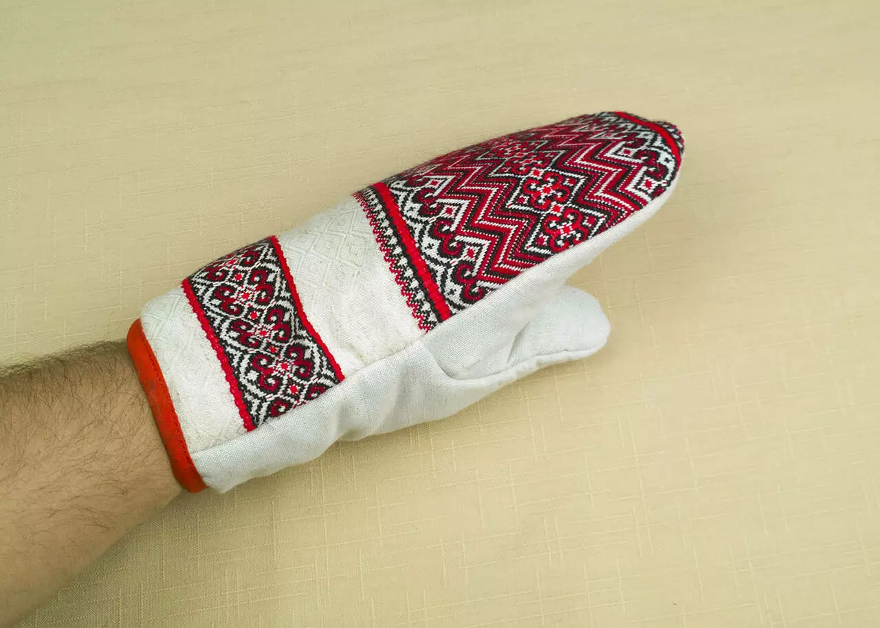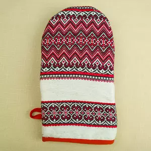 Эта прихватка-варежка станет достойным помощником хозяюшки на кухне! Достаточно плотная ткань и мягкий наполнитель позволят ей длительное время служить Вам. Контрастный орнамент добавит в интерьер народных нот. Рукавица украшена цветной петелькой, вследствие чего этот кухонный аксессуар всегда будет на своем месте.