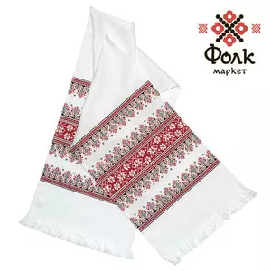 Традиційний червоний рушник широко використовується в українських обрядах. Використана машинна вишивка "рахунковим хрестом".