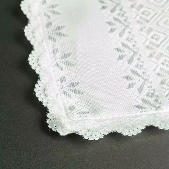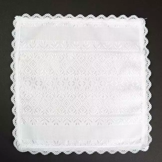 Серветка на білому полотні з білим тканим орнаментом. Серветка оздоблена білим мереживом. Розмір 25*25см. Можна використовувати як серветку під весільні обручки, так і свічки.