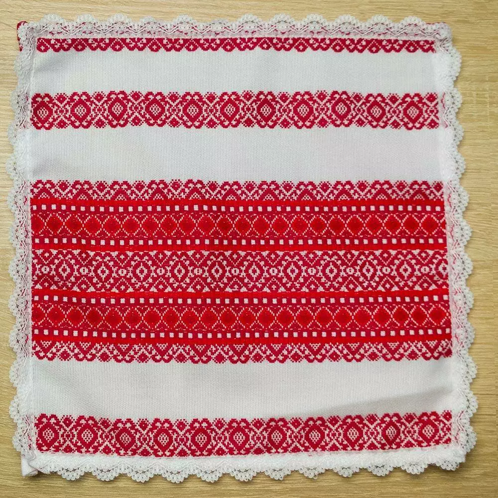 Серветка на білому полотні з червоним тканим орнаментом. Серветка оздоблена ніжним мереживом. Розмір 25*25см. Серветку можна використовувати для весільних обручок або свічок.