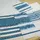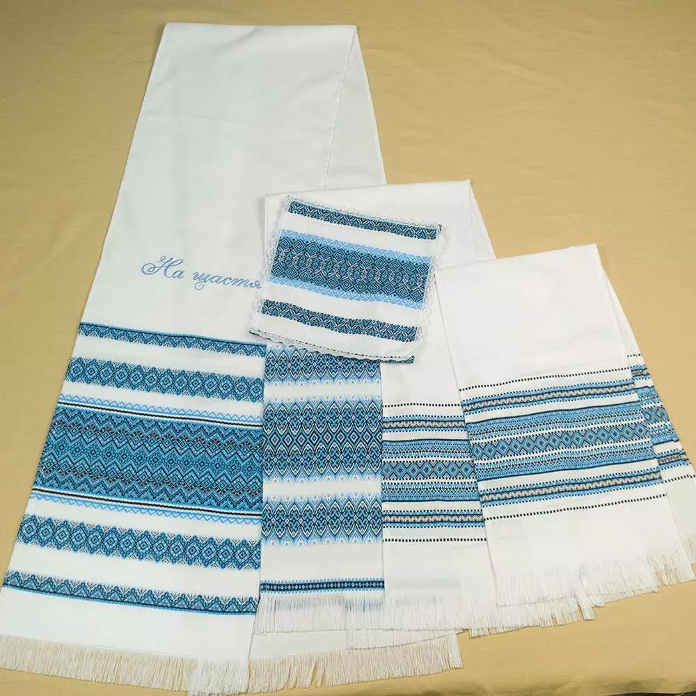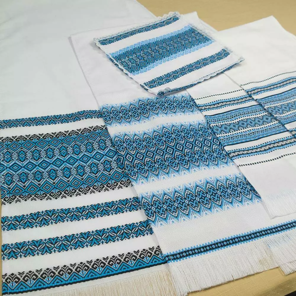 Рушники і серветка с тканим синім орнаментом. Орнамент зроблений з акрилових ниток, що надає їм святкового вигляду. Тканий орнамент зблизька виглядає як вишивка гладдю, а по ціні набагато доступніше.