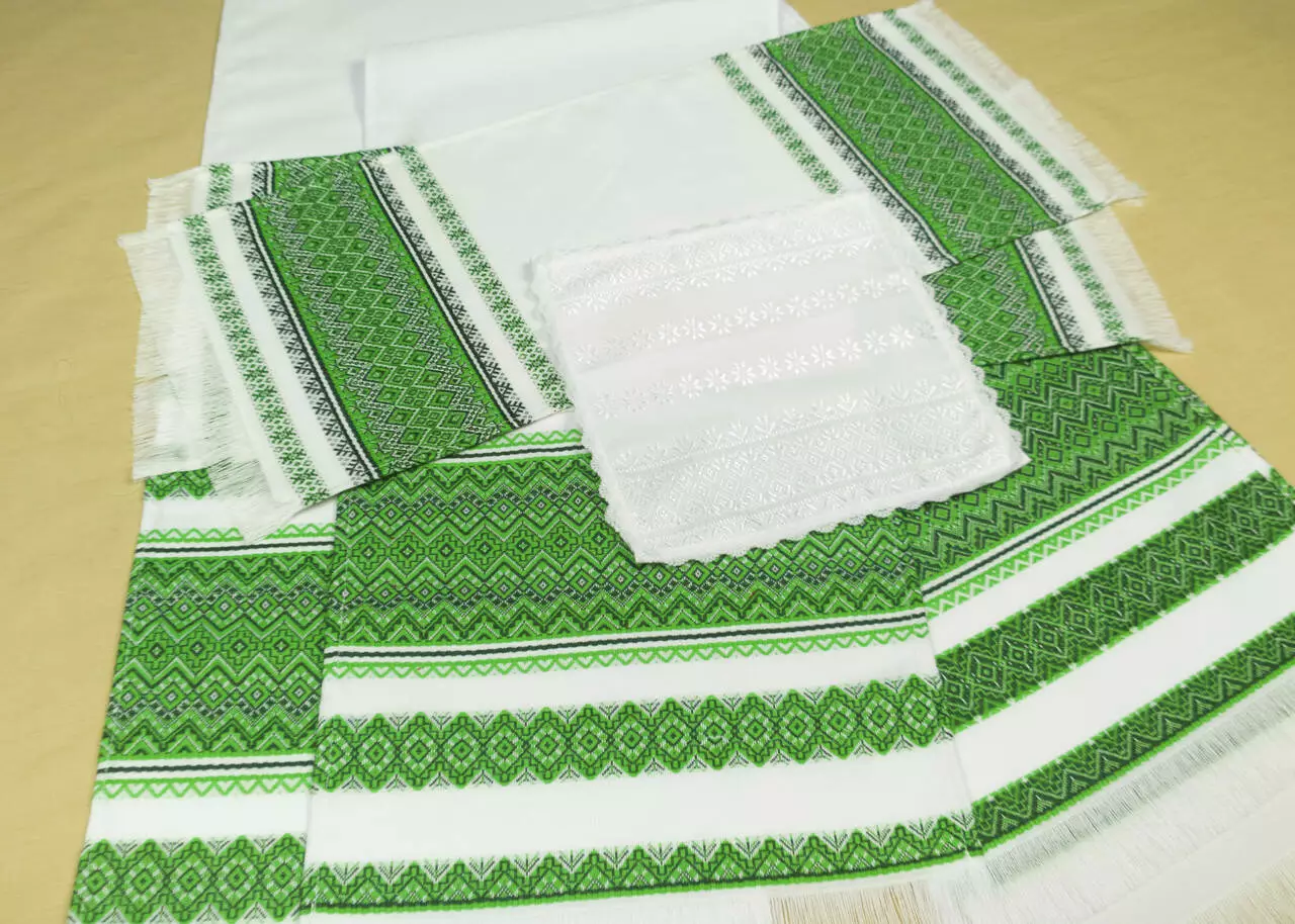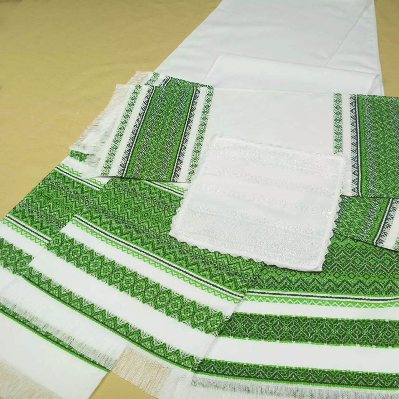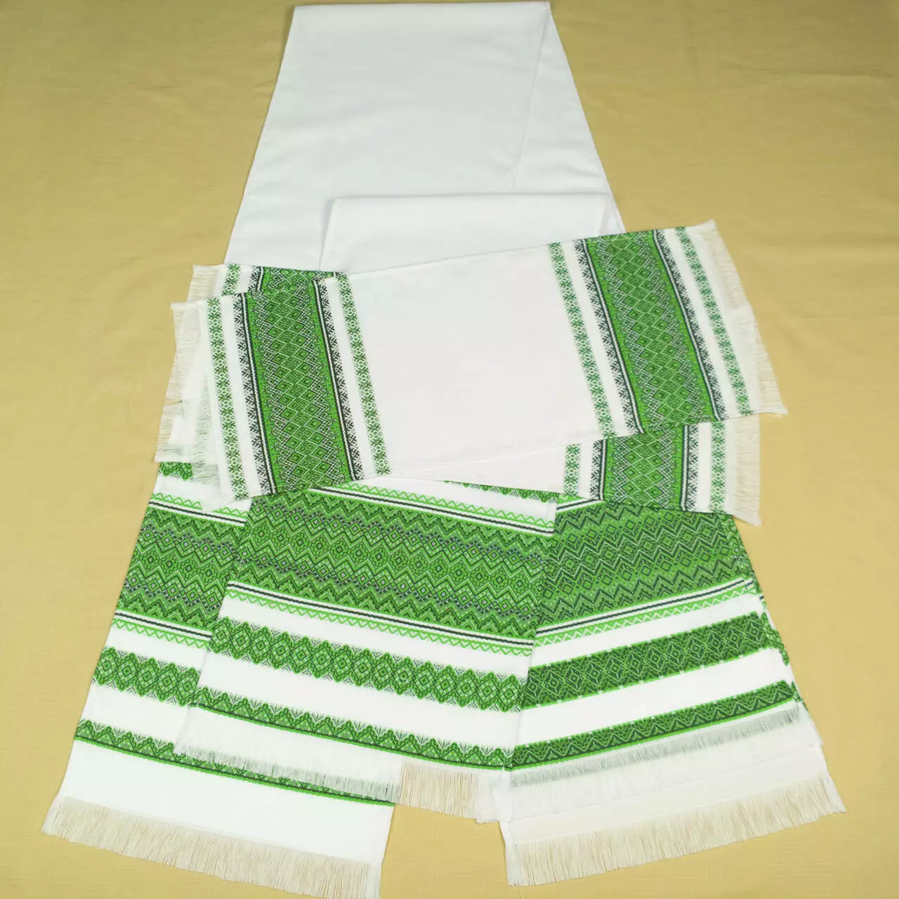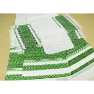 Рушники і серветка с тканим зеленим орнаментом. Орнамент зроблений з акрилових ниток, що надає їм святкового вигляду. Тканий орнамент зблизька виглядає як вишивка гладдю, а по ціні набагато доступніше.