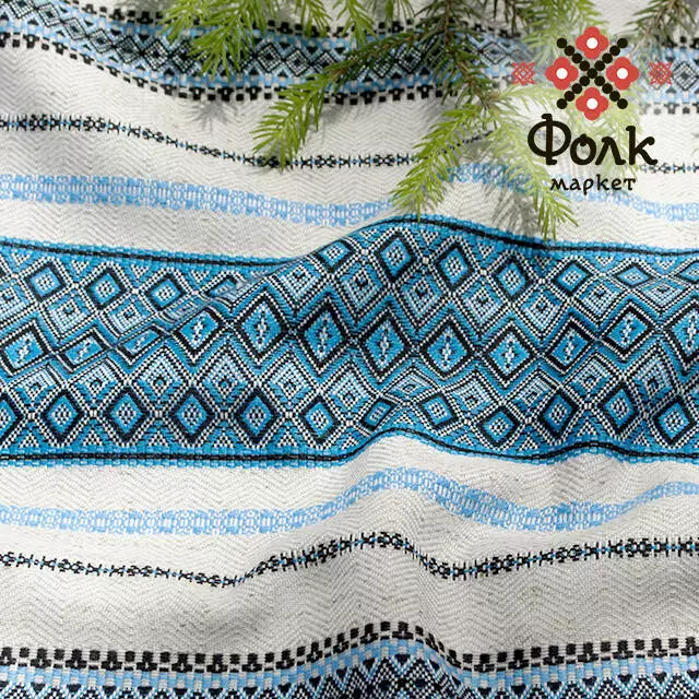 Синій вінчальний рушник з вишивкою на лляній основі, який часто використовується в українських обрядах.