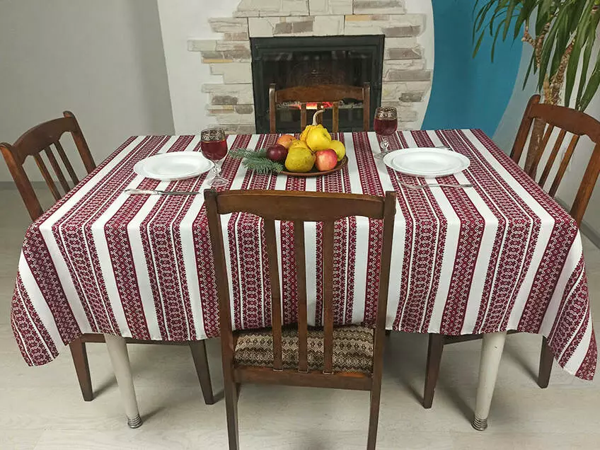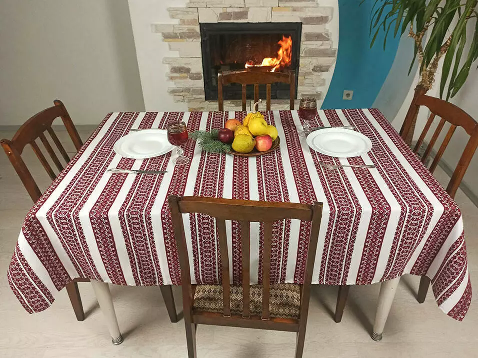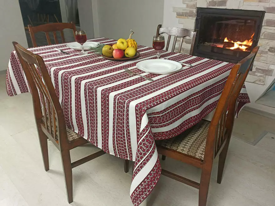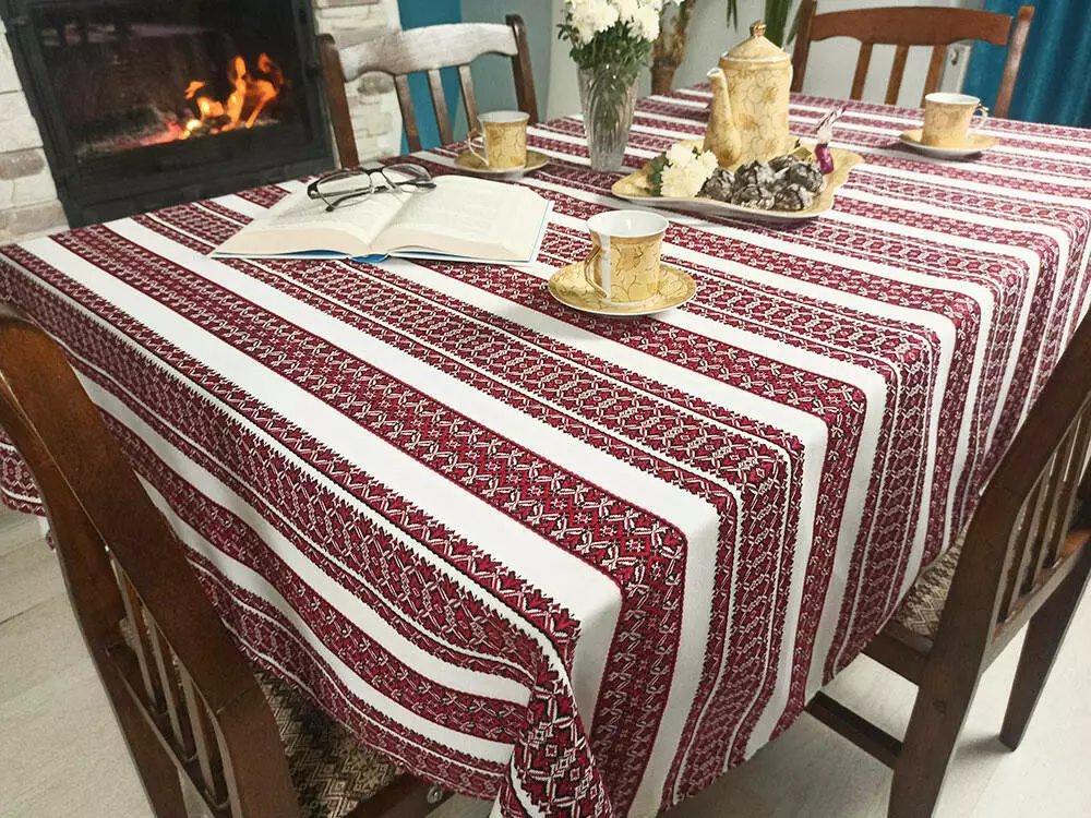 У нас большой выбор тканых вышитих скатертей с украинским орнаментом.