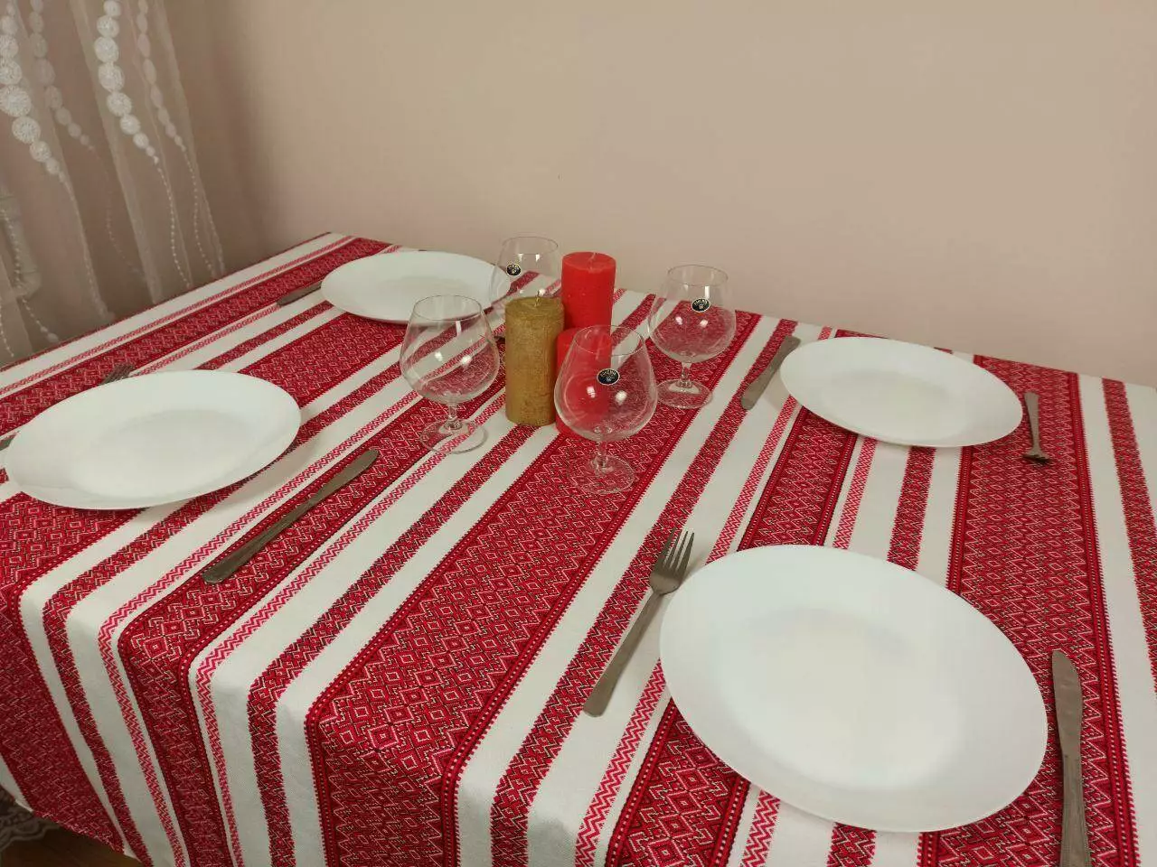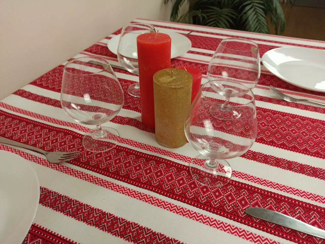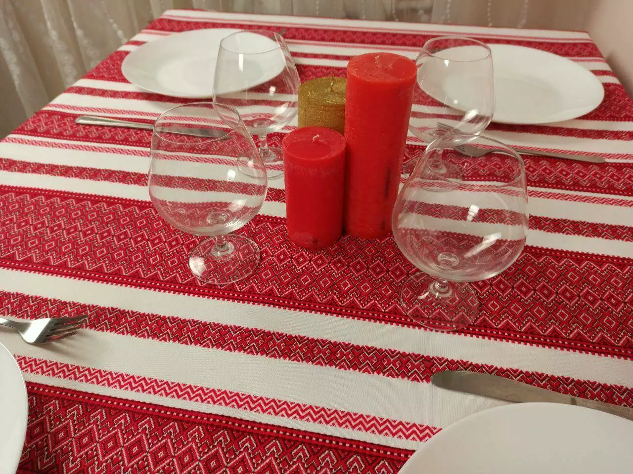 У нас большой выбор тканых вышитих скатертей с украинским орнаментом.