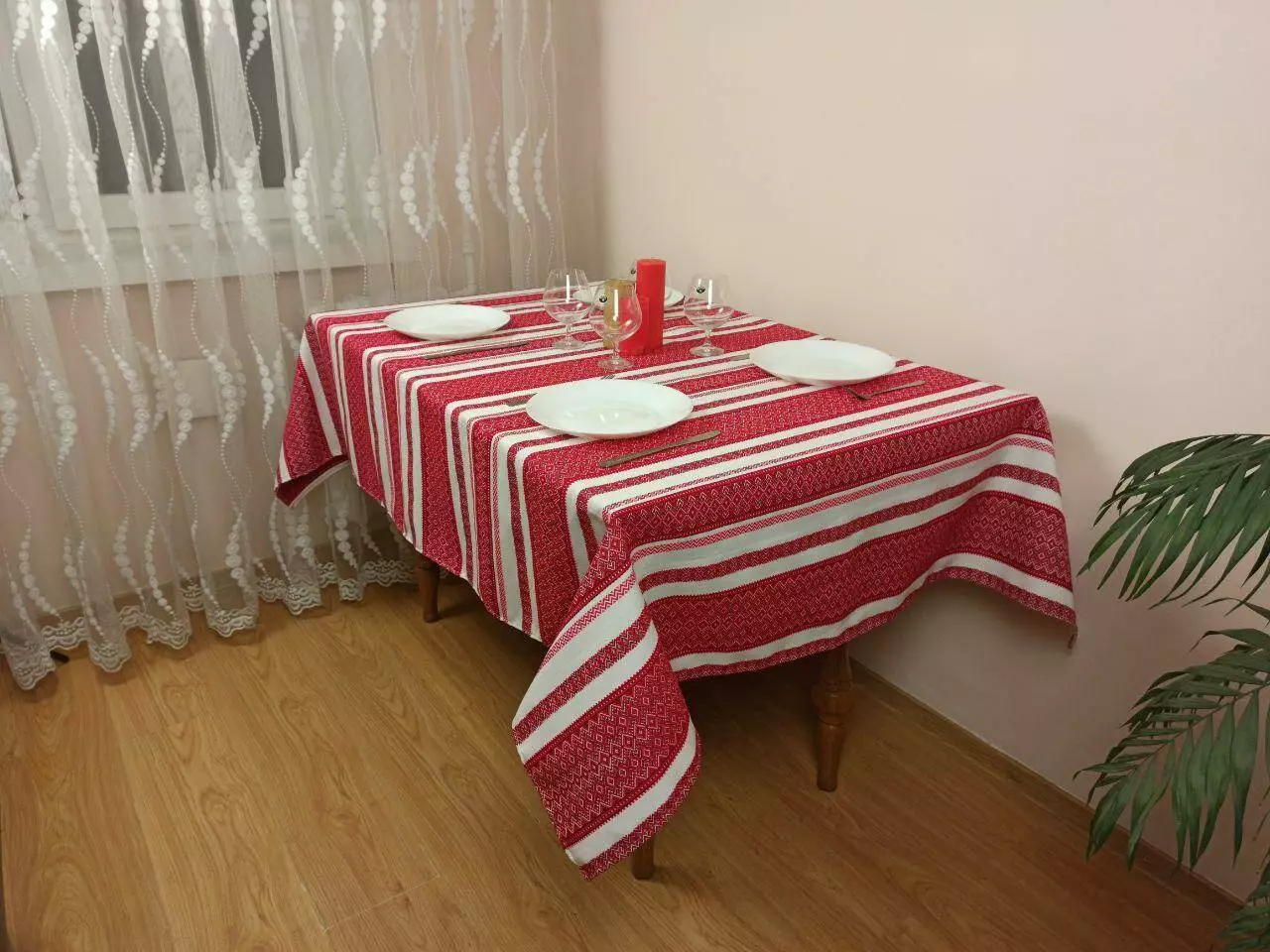 Эта яркая скатерть с уникальным орнаментом хорошо подойдет для домашнего использования, как элемент праздничного декора или на подарок.
