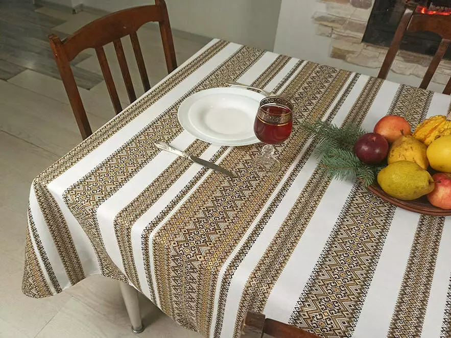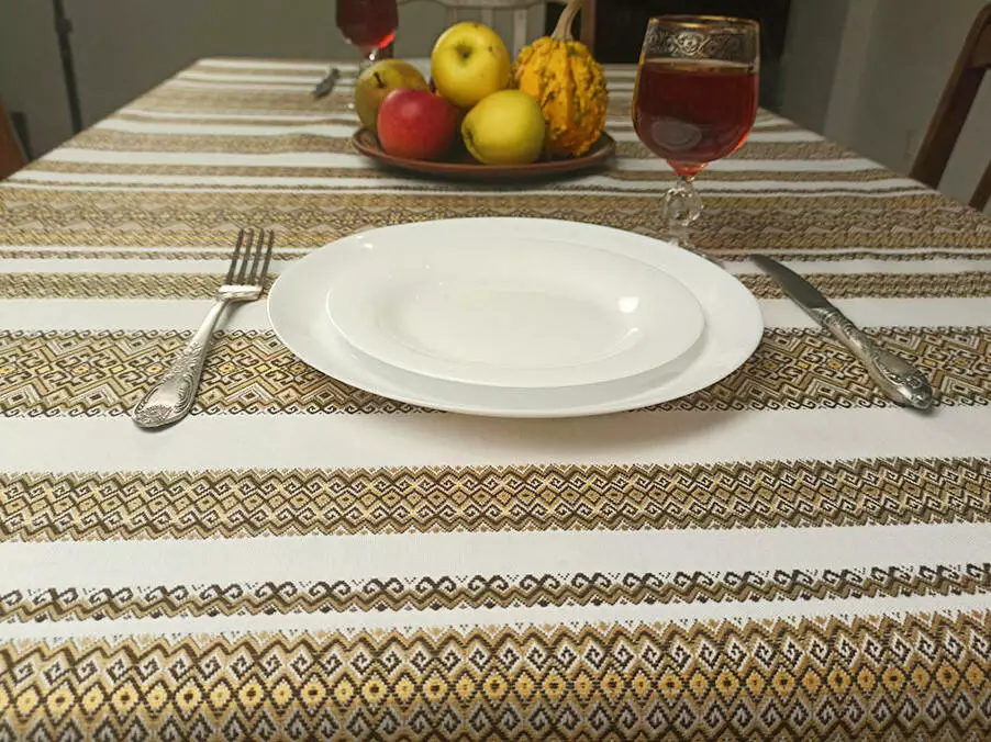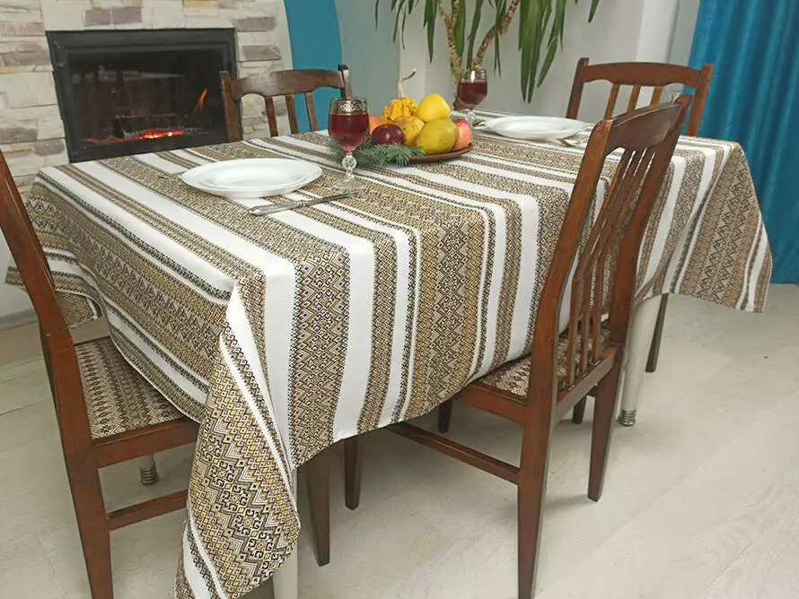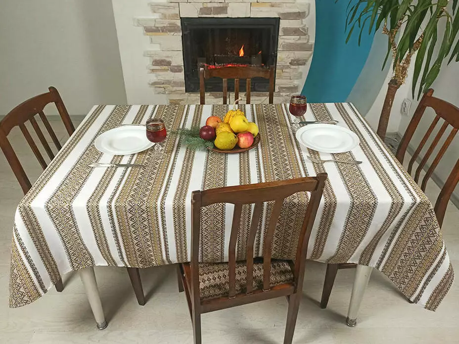 Эта яркая скатерть с уникальным орнаментом хорошо подойдет для домашнего использования, как элемент праздничного декора или на подарок.