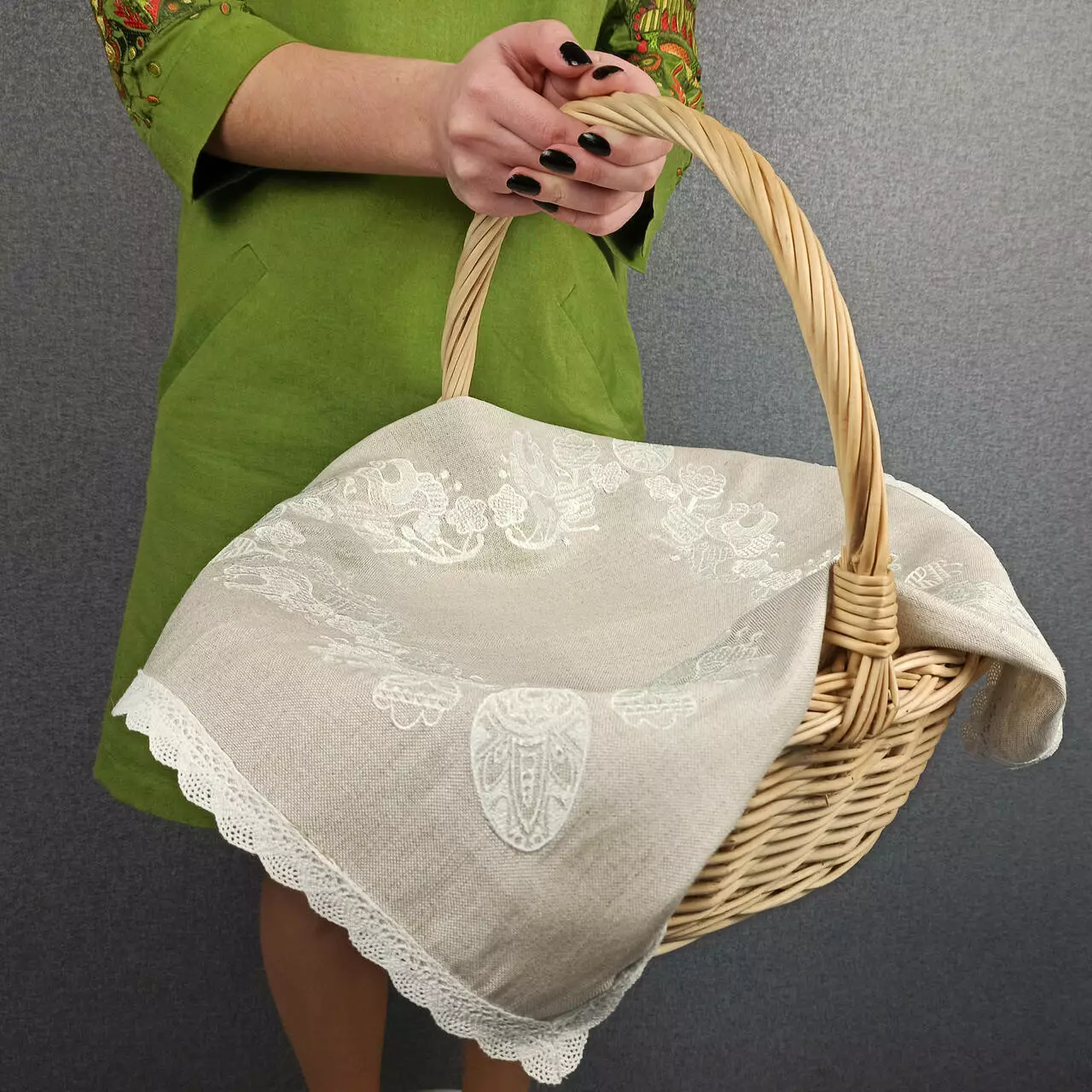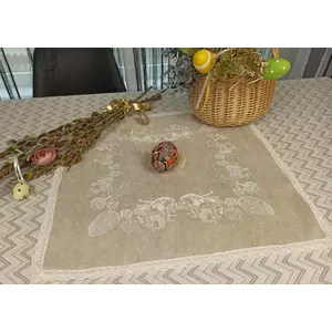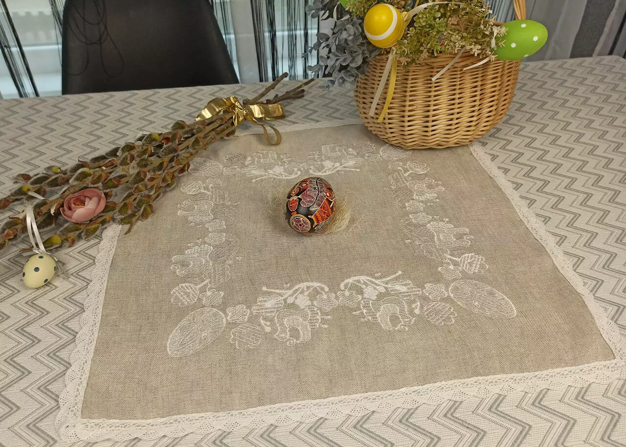 Лляна великодня серветка з ніжним мереживом і красивою композицією з писанок, вишита білими нитками. Її можна використовувати як столешню або накидку на кошик. На писанках традиційні символи сонця, життя, здоров'я, родючості.