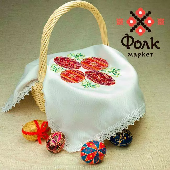 Білосніжна великодня серветка з ніжним мереживом і красивою композицією з писанок. На писанках традиційні символи сонця, життя, здоров'я, родючості.