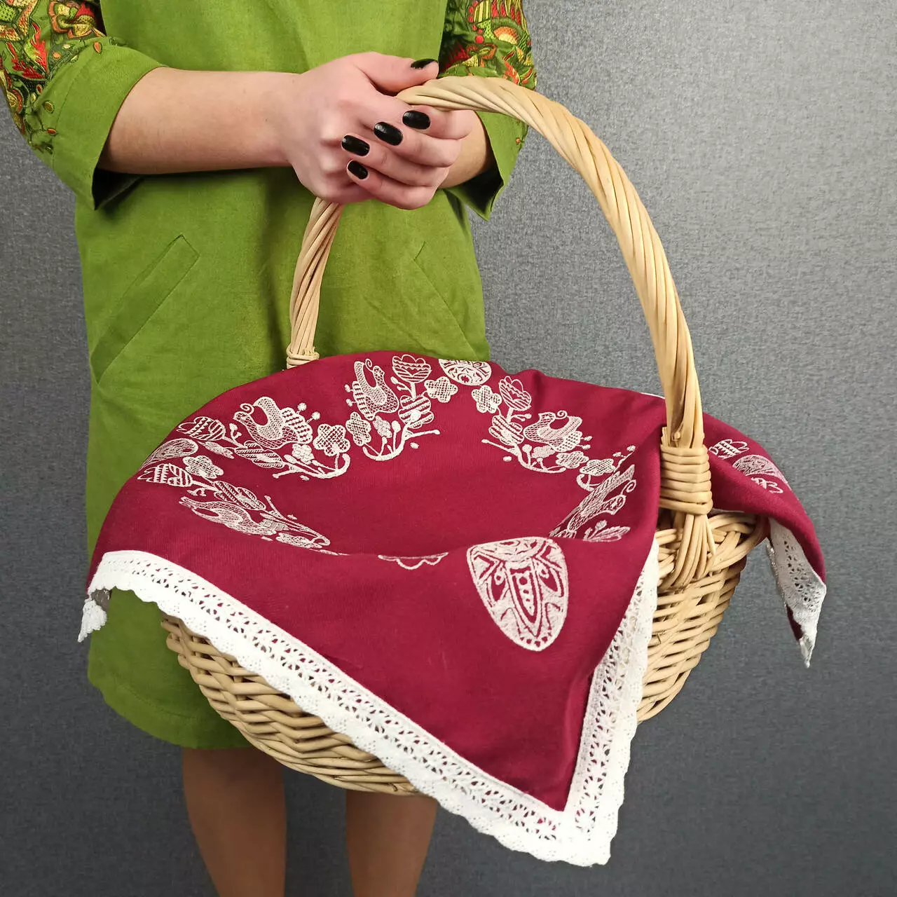 Пасхальна серветка на зеленому домотканому полотні, з мереживом по краях, прикрашена машинною вишивкою гладдю в білому кольорі. Розмір достатній, щоб використовувати для великоднього кошика середнього і великого розміру, або як столешню на стіл.