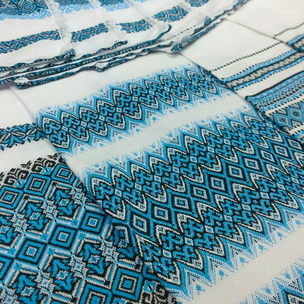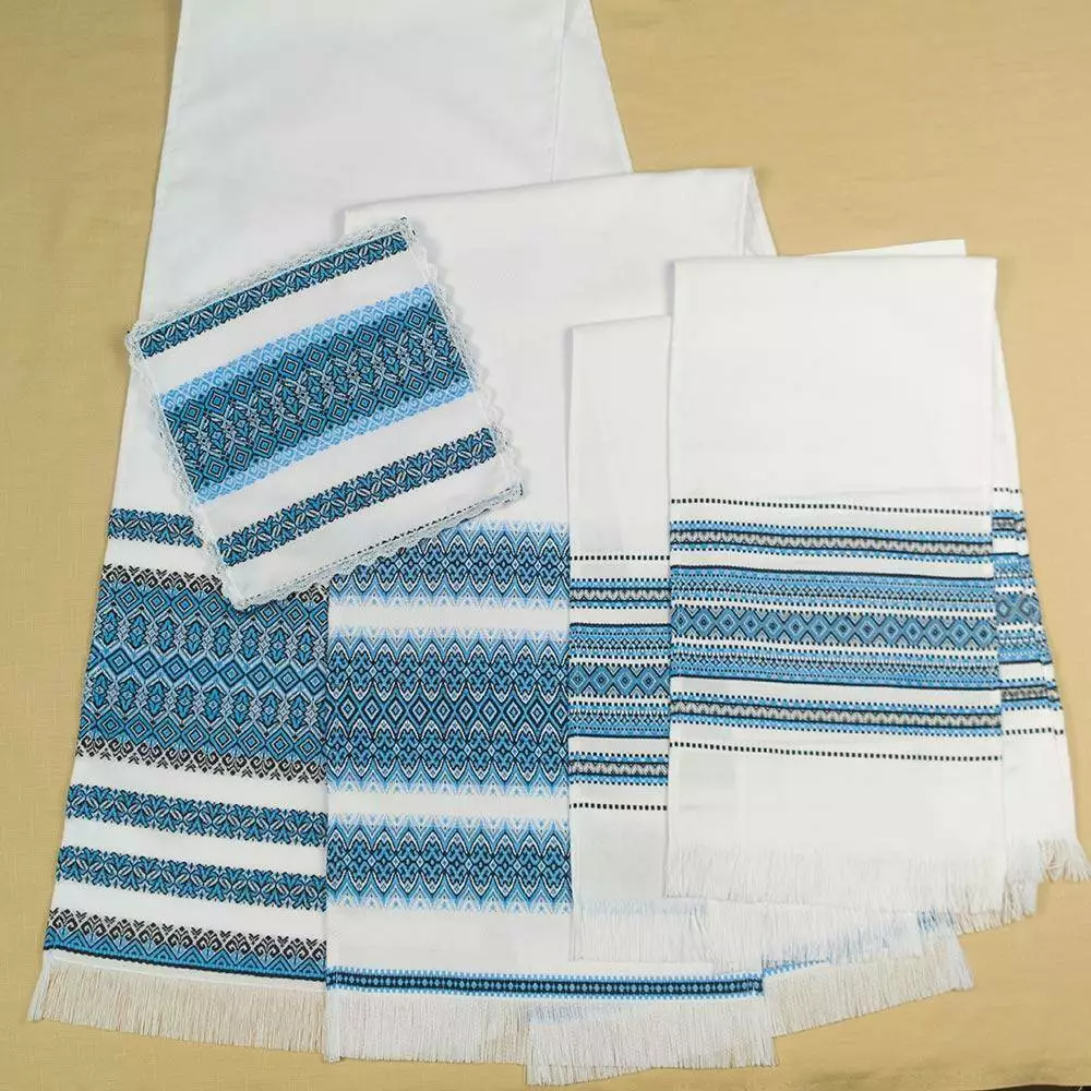 Рушники і серветка с тканим синім орнаментом. Орнамент зроблений з акрилових ниток, що надає їм святкового вигляду. Тканий орнамент зблизька виглядає як вишивка гладдю, а по ціні набагато доступніше.