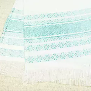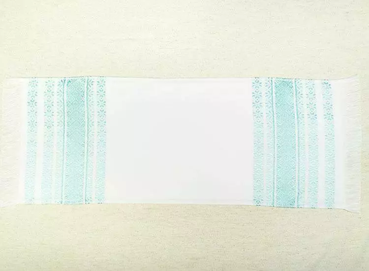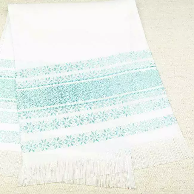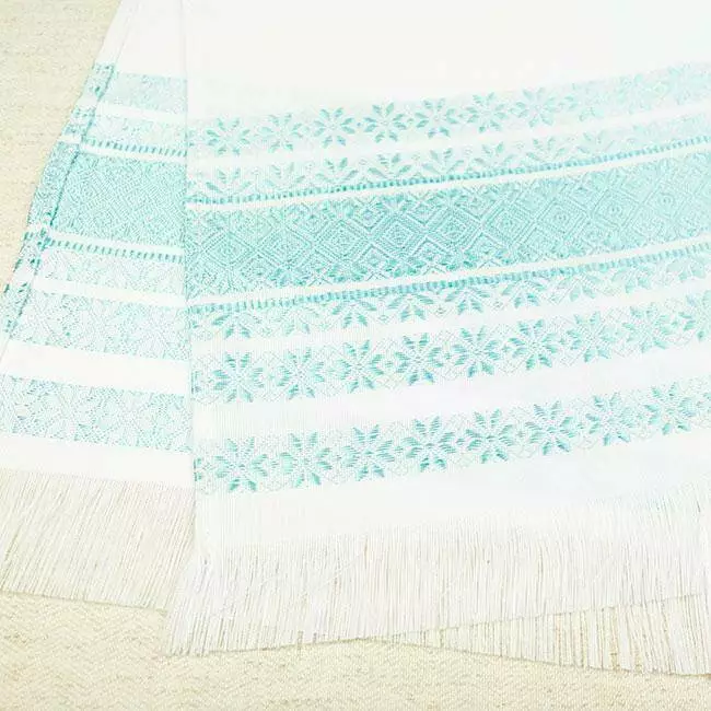 Невеликий рушничок з тканим орнаментом бірюзового кольору.