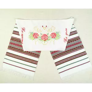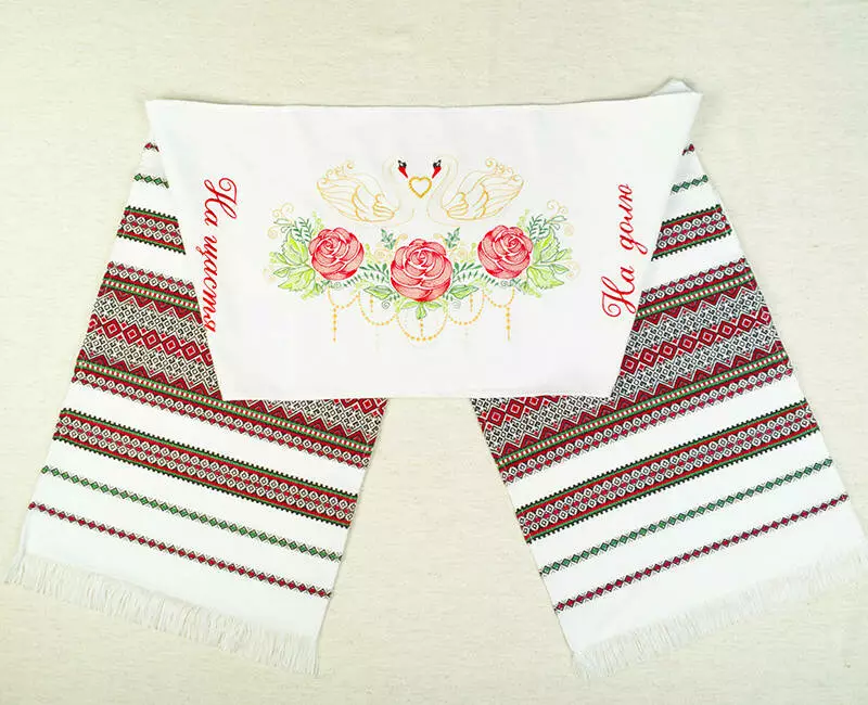 Весільний рушник з вишивкою "На щастя. На частку", який часто використовується в українських обрядах.