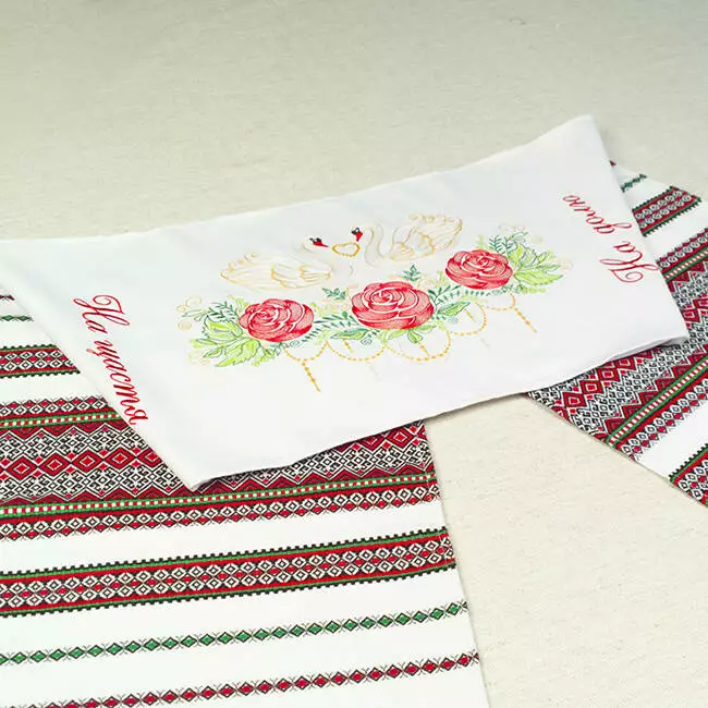 Вишитій доріжкою прикрашають ікони, якими благословляють молодят батьки. Коровай завжди несуть на вишитому рушнику. Молодим кладуть вишивану доріжку на весілля "На щастя На долю" під ноги, і звичайно ж використовують весільний рушник для зв'язування рук.