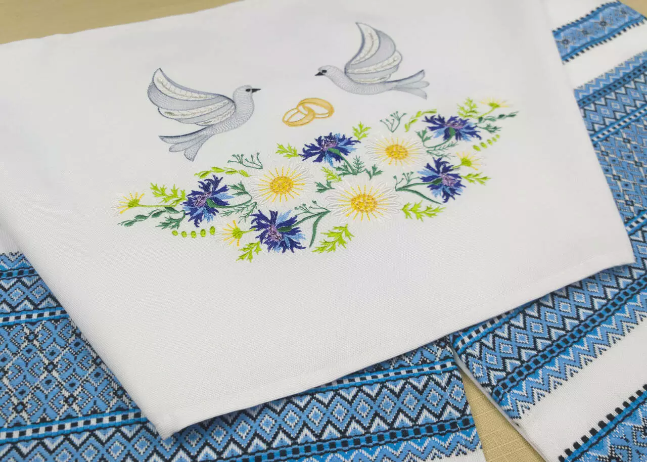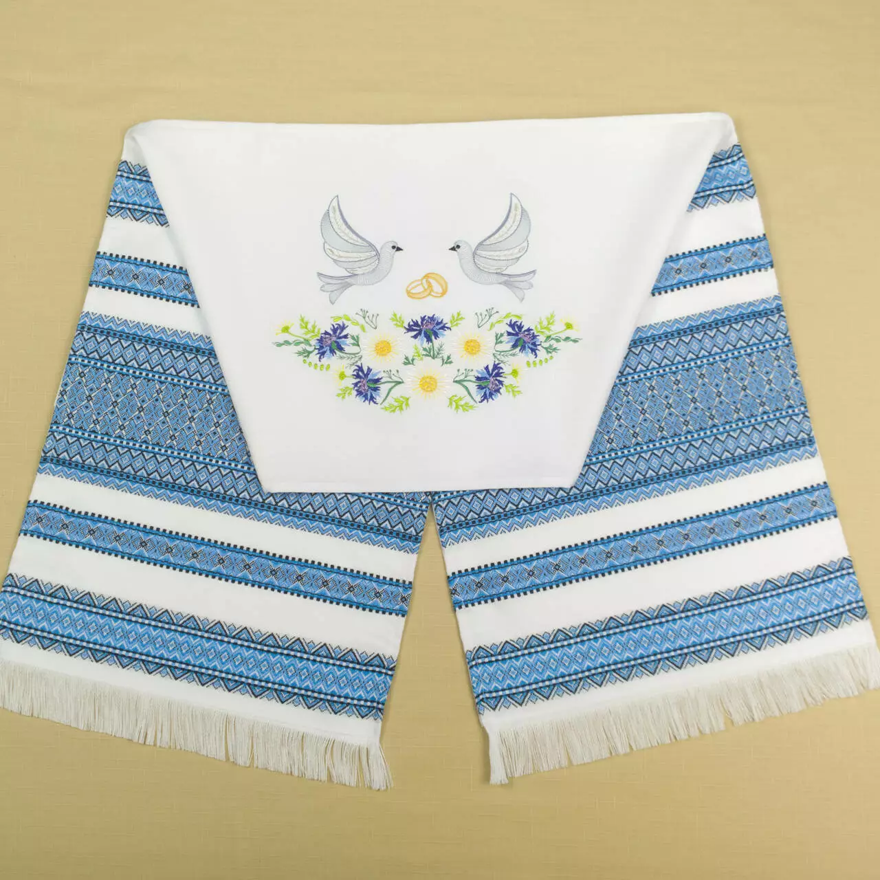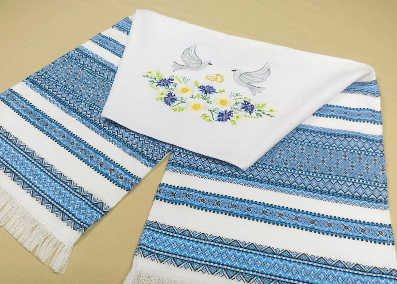 Вишитій доріжкою прикрашають ікони, якими благословляють молодят батьки. Коровай завжди несуть на вишитому рушнику. Молодим кладуть вишивану доріжку на весілля "На щастя На долю" під ноги, і звичайно ж використовують весільний рушник для зв'язування рук.