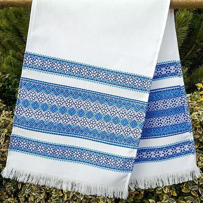 Синій весільний рушник з вишивкою, який часто використовується в українських обрядах.